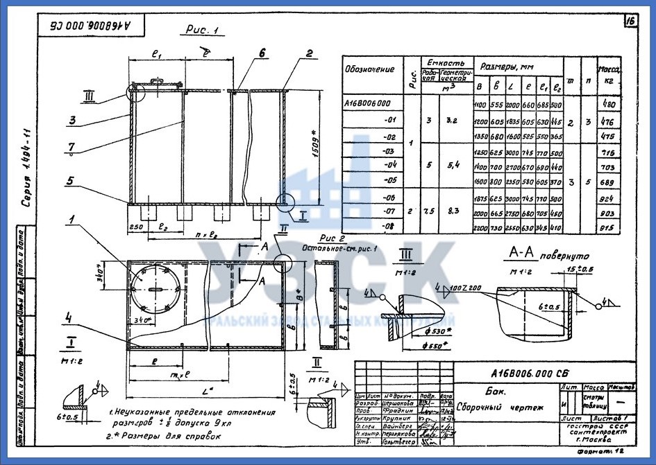 | 15 | Бак прямоугольный | А16В 100.000 | 5 | 1250 | 3000 | 1508 | серия 5.904-43 | 680кг |