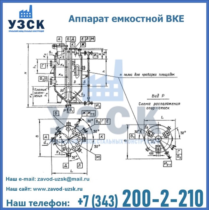 Емкостные аппараты ВКЭ представляют емкость с эллиптической крышей и коническим днищем. аппарат может использоваться в Евпатории для приема и хранения жидкостей и взрыво- и пожароопасных веществ. Создаваемое давление не должно превышать 0,6; 1,0 МПа. Емкости ВКЭ выполняются как цельносварные. Используется марка стали, отвечающая степени агрессивности продукта и температуре эксплуатации.