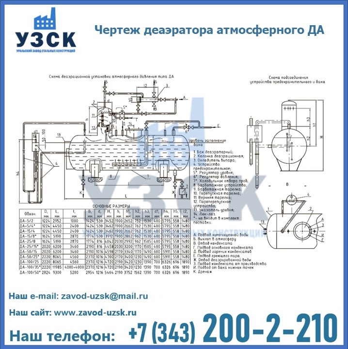 Приобрести качественное оборудование, в том числе, деаэраторы ДА, можно в компании УЗСК в Евпатории. Мы предлагаем долговечную и надежную продукцию по приемлемой цене. Заказать и купить деаэраторы или другие изделия высокого качества можно через сайт Уральского Завода Стальных Конструкций, или позвонив по указанному в разделе «Контакты» телефону.